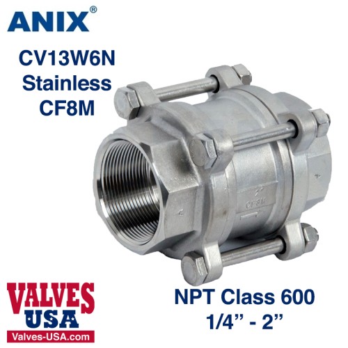 Check Valve, API, Stainless Steel, 3-Piece, 600# NPT Threaded, 1/4" to 2"